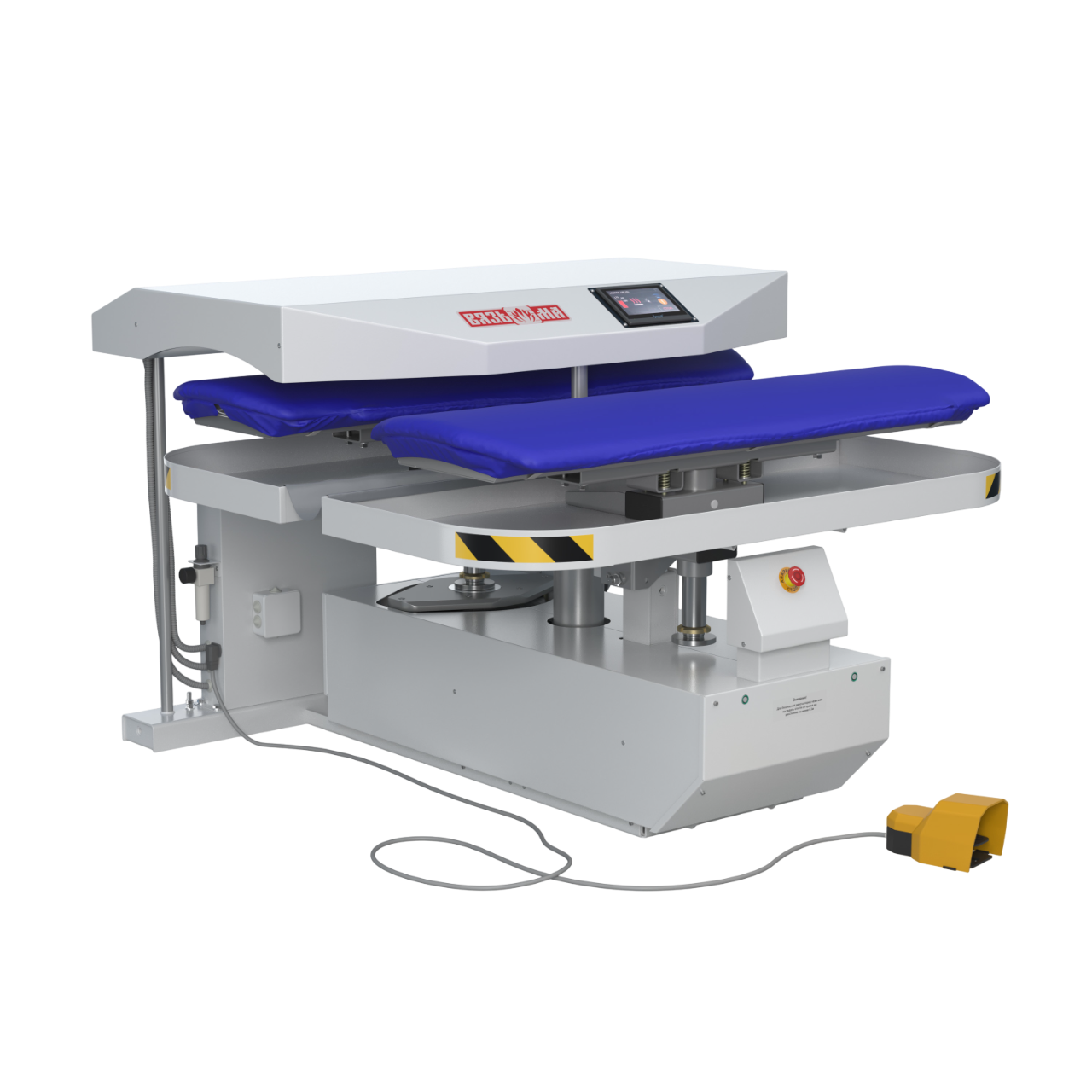Промышленные гладильные прессы карусельного типа ВР предназначены для глажения прямого и фасонного белья. Принцип глажения состоит в поочередном прижиме гладильных столов с уложенным на них бельем к нагретой верхней гладильной плите, пока один стол прижат - происходит процесс глажения, в это время на втором столе оператор раскладывает другое белье. По окончании глажения первый стол опускается, как только оператор нажимает педаль - столы меняются местами. Процесс глажения повторяется для второго стола. Выглаженное белье заменяется новым, и цикл повторяется.